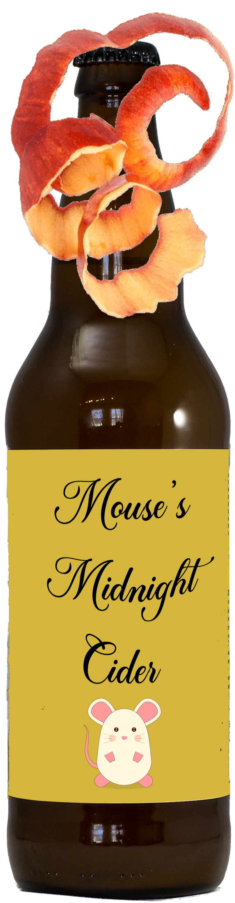 Mouse's Midnight Cider - A crisp dry cider layered with dark cherry and a hint of warm cinnamon, creating a rich, dusky twist on a classic. Light, flavorful, and cider-forward, it finishes with a playful nod of apple peel and a tiny ‘cheese’ bite on the side.